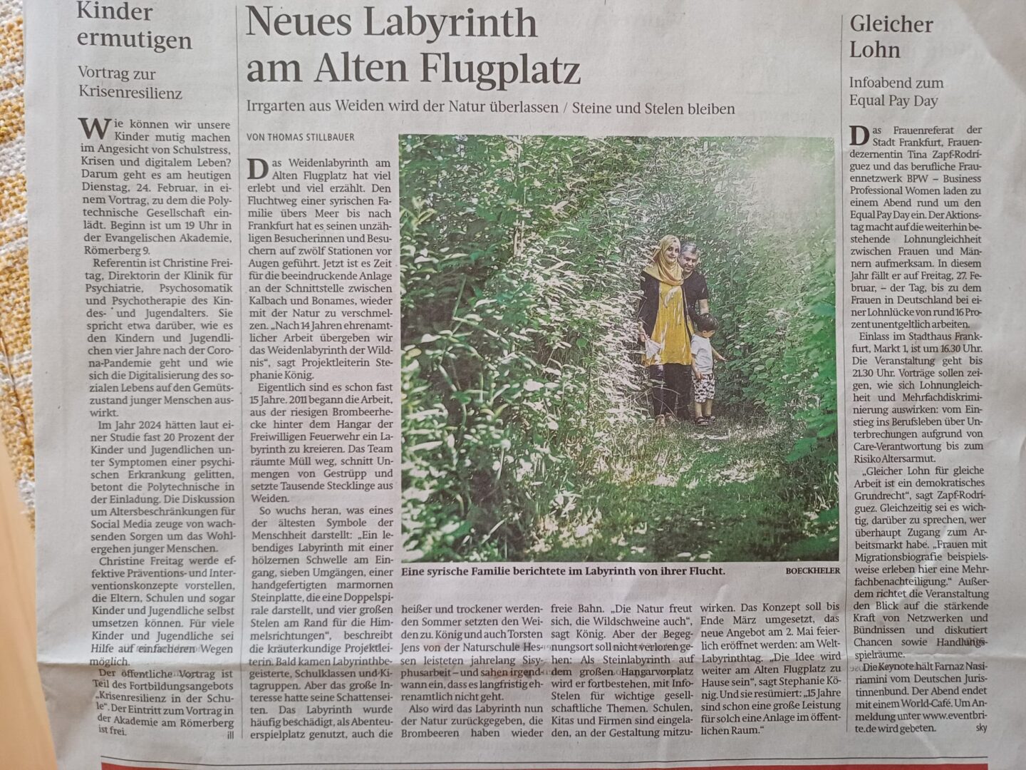 Hinweise und News Aktuelles 25. Februar 2026 | Aktuelles Neues Labyrinth am Alten Flugplatz Jetzt ist es öffentlich. Halbseitig in der Rundschau zu lesen. Das Weidenlabyrinth wird wieder Wildnis. Und ein Herzensprojekt … 18. Februar 2026 | Aktuelles Ran ans Klima Die Frankfurter Bürgerstiftung CITOYEN sucht für ihren Wettbewerb 2026 Initiativen von Einzelgruppen oder Gruppen, die sich für … 18. Februar 2026 | Aktuelles Weidenlabyrinth wird wieder zur Wildnis Viele Jahre ist es her, da haben wir aus einer riesigen Brombeerhecke und wuchernden Gesträuch ein Labyrinth gestaltet. Aus Weiden … 18. Februar 2026 | Aktuelles Einsatz für Kröten und Frösche im Stadtwald Der Zaun steht. Jetzt können sie kommen. Die hoffentlich zahlreichen Kröten, Frösche und Molche. Und auch gerne die vielen kleinen … 24. Juni 2025 | Aktuelles Weltflüchtlingstag Anlässlich des 20. Juni haben wir erneut die Fluchtgeschichte von Khaled und seiner Familie in der Steinspirale abgebildet. … 9. März 2025 | Aktuelles Das Tower Café macht Power Kaffee Die Gastro am Alten Flugplatz öffnet ihre Türen und ihre Herzen … 18. Februar 2025 | Aktuelles Jahresausbildung in Kräuterheilkunde Am 30. März startet die nächste Jahresausbildung in Kräuterheilkunde! In sechs Modulen viel Praxis und Theorie. … 17. Februar 2025 | Aktuelles Ab Mitte Februar 2025 Es geht bald los... … 12. Dezember 2024 | Aktuelles Ab 20. Dezember Das Jahr geht zur Neige. Und wir verneigen uns vor all unseren Gästen. Ordnen Zahlen, Konten und Begegnungen … 9. Dezember 2024 | Aktuelles Adventszeit Das Team der Naturschule Hessen wünscht Ihnen und Euch eine besinnliche Adventszeit … 9. April 2024 | Aktuelles April 2024 Endlich ist es wieder soweit. Die letzten Vorbereitungen sind getroffen. Seit mehr als zehn Jahren bereise ich die Wälder … 25. Januar 2024 | Aktuelles Ab Februar 2024 Freiwillige gesucht. Wer sich ehrenamtlich für den Schutz heimischer Amphibien im Frankfurter Stadtwald Bereich Oberschweinstiege … 10. Januar 2024 | Aktuelles 25 Jahre Naturschule Hessen In diesem Jahr feiern wir 25 Jahre Naturschule Hessen. Zum Geschenk haben wir uns eine neue Homepage gemacht. Vielmehr machen … 8. Januar 2024 | Aktuelles Ab 17. März 2024 Wer sich schon immer für den Bereich der Kräuterheilkunde interessiert, hat die Gelegenheit Grundwissen zu erwerben und Kenntnisse …